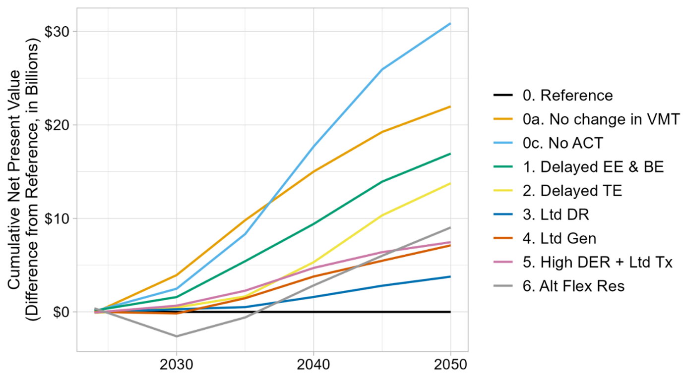 Scenarios 1-3 demonstrate the cost of delaying action on energy efficiency and building electrification (Delayed EE & BE), transportation electrification (Delayed TE), and demand response (Ltd DR). Scenario 4 demonstrates the cost of relying less on in-state generation and more on imported renewable resources (Ltd Gen), compared to the Reference, which sought the least cost combination of in-state generation and imports. Scenario 5 shows the increased cost of relying on distributed resources in a transmission-constrained situation (High DER+Ltd Tx). Scenario 6 shows the increased cost if the power system cannot rely on a combination of fossil and low-carbon gas for reliability, though notably this scenario’s increased costs are due in part to significant economic development occurring in the state to produce more low-carbon fuels (Alt Flex Res).